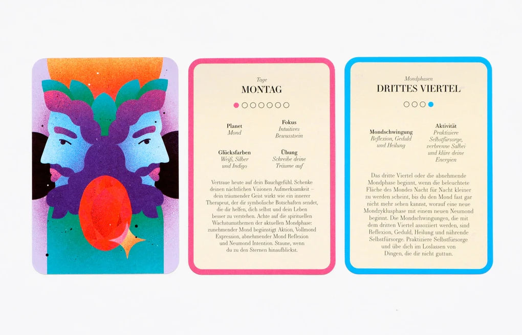 Wusstet ihr, dass jeder Tag des Jahres mächtige Energien in sich trägt, die ihr euch zunutze machen könnt, um euer Leben zu verändern? Macht das Beste aus jedem Tag des Jahres und erstellt einzigartige tägliche Lesungen, stimmt euch auf eure ganz persönliche Magie ein und lernt, die kosmische Kraft jedes Tages, Datums, Monats, der astrologischen Jahreszeiten und der Mondphasen zu nutzen. Entdeckt mit diesen 46 Karten und dem Booklet, wie jeder Tag zum perfekten Tag werden kann!