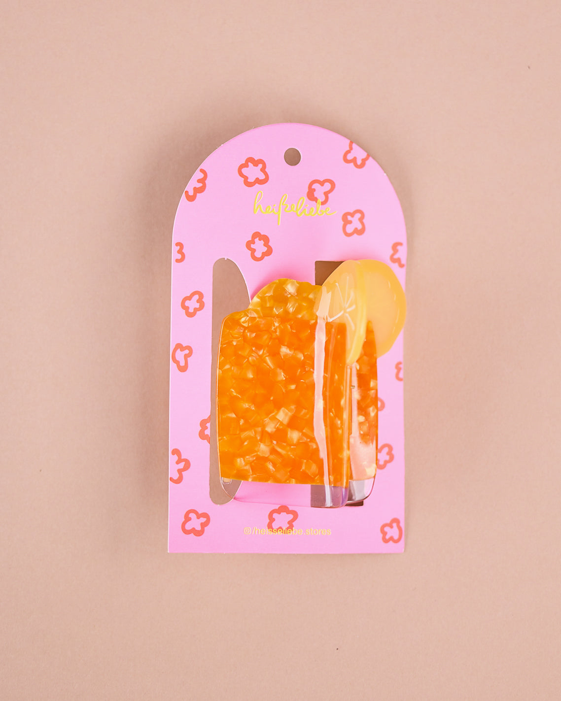 Diese verspielte Haarspange im Cocktail-Design bringt Urlaubsfeeling in dein Styling. Die leuchtenden Orangetöne mit Zitronen-Detail machen die Spange zu einem frischen Hingucker und erinnern an sommerliche Drinks bei Sonnenuntergang. Gleichzeitig hält sie dein Haar zuverlässig im Alltag und ist angenehm leicht zu tragen.