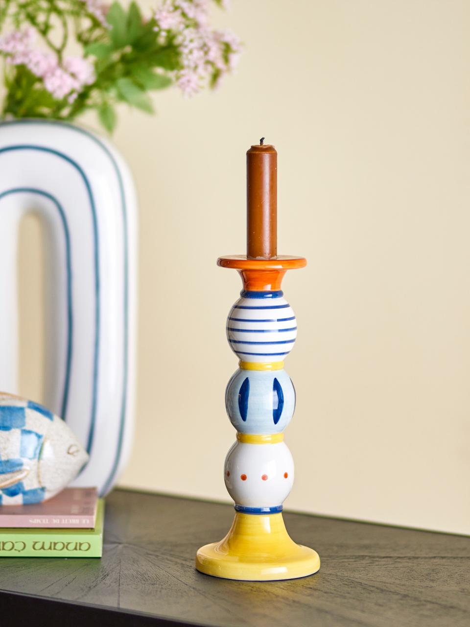 Der Kairi Kerzenhalter von Bloomingville ist handbemalt und farbenfroh, gestaltet, um Ihrer Einrichtung Charme zu verleihen. Mit seinen auffälligen Mustern und lebendigen Farben wird er zu einem charakteristischen Element in jedem Raum. Platzieren Sie diesen Kerzenhalter auf einem Regal, dem Esstisch oder in der Fensterbank, um eine stimmungsvolle Atmosphäre zu schaffen. Die handbemalten Details machen jeden Kerzenhalter einzigartig und stellen sicher, dass kein Stück dem anderen gleicht.