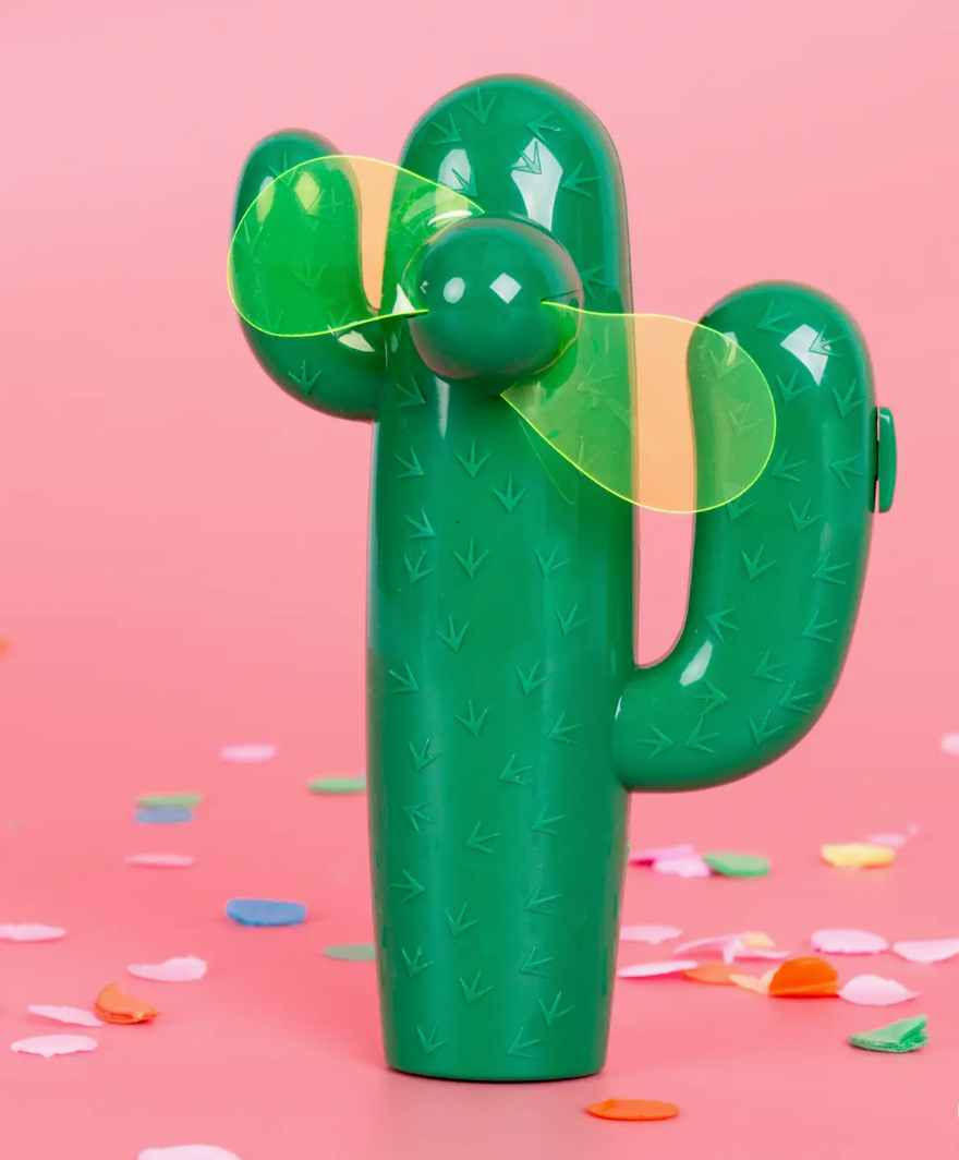 Mini-Handventilator in Kaktusform. Er verfügt über zwei weiche Flügel aus EVA-Gummi, die per Knopfdruck aktiviert werden. Er kann auf einer ebenen Fläche aufgestellt werden und benötigt zwei AAA-Batterien (nicht im Lieferumfang enthalten).