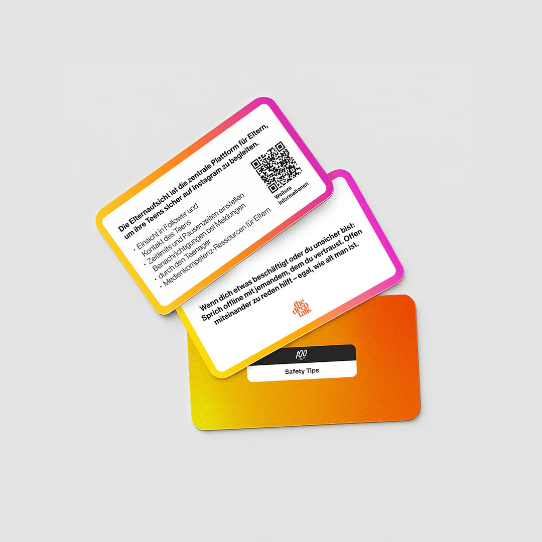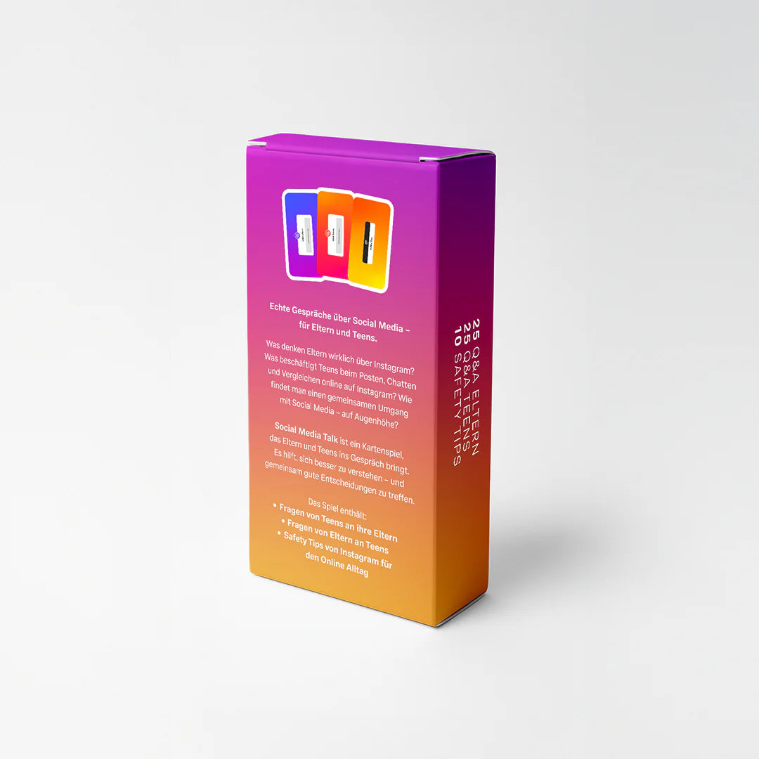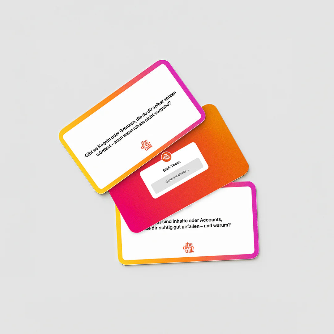 Fragen, die verbinden! Mit den Fragekarten könnt ihr einander besser verstehen: Was bewegt Teens online wirklich? Was wünschen sich Eltern? Ihr kommt ins Gespräch – über Chancen, Grenzen und Gefühle rund um Instagram.
