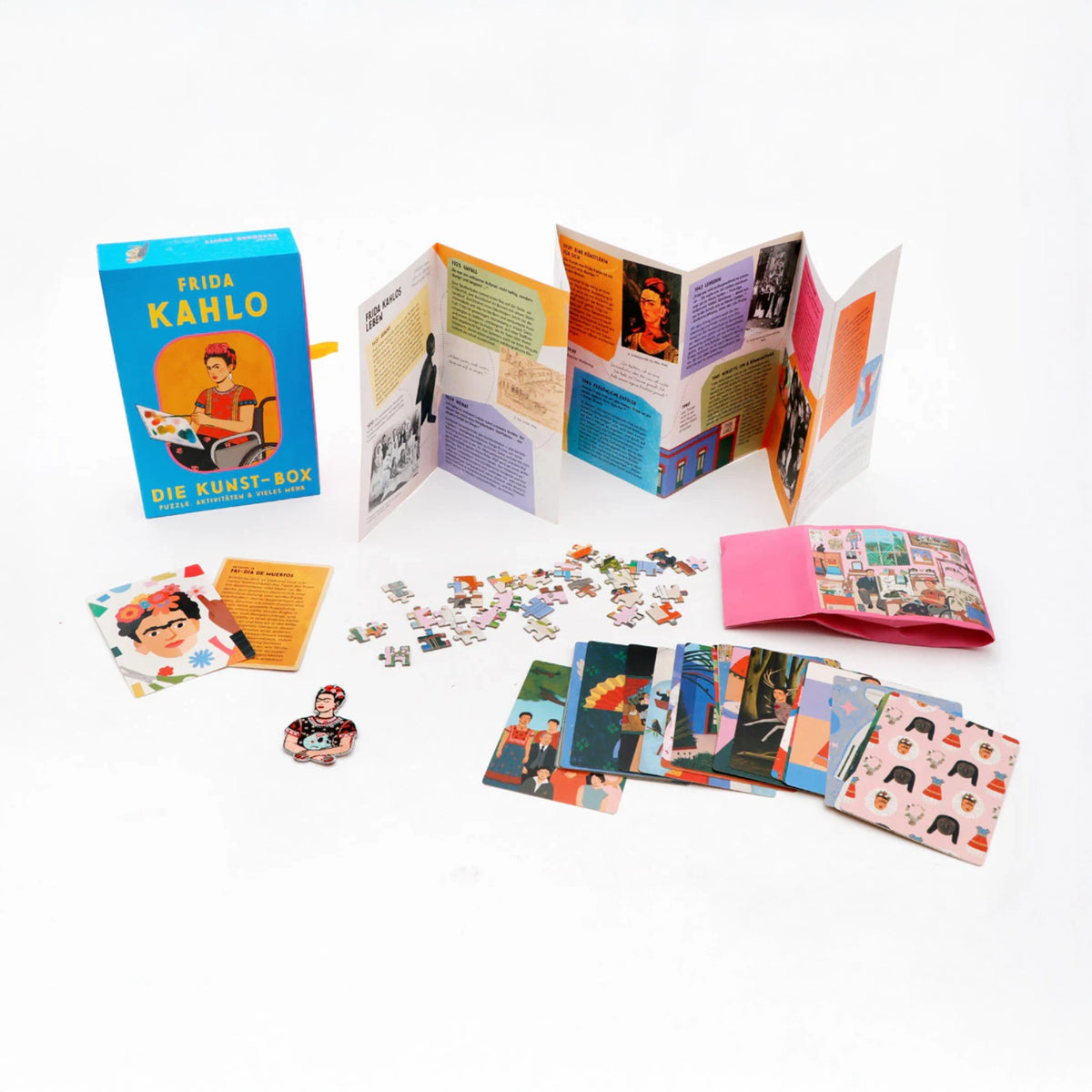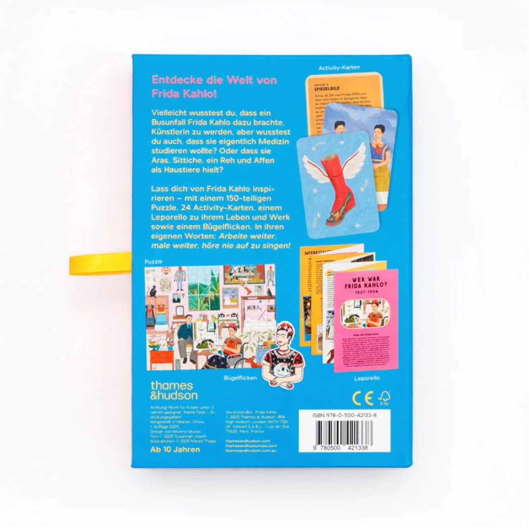 Entdecke Frida Kahlo auf neue Weise, indem du ihre Selbstporträts nachstellst, Rätsel löst oder ein von Frida Kahlo inspiriertes Festmahl kochst. Oder du setzt ein 150-teiliges Puzzle von Fridas Atelier zusammen und entdeckst dabei fünf ihrer Bilder, zwei Liebhaber und sieben ihrer Haustiere. Du kannst aber auch ein modisches Zeichen setzen und den beiliegenden Bügelflicken auf dein Lieblingsstück bügeln. All das wird begleitet von einem umfassenden Leaflet mit jeder Menge Wissenswertem, einer Zeitleiste und den wichtigsten Orten aus Fridas Leben.