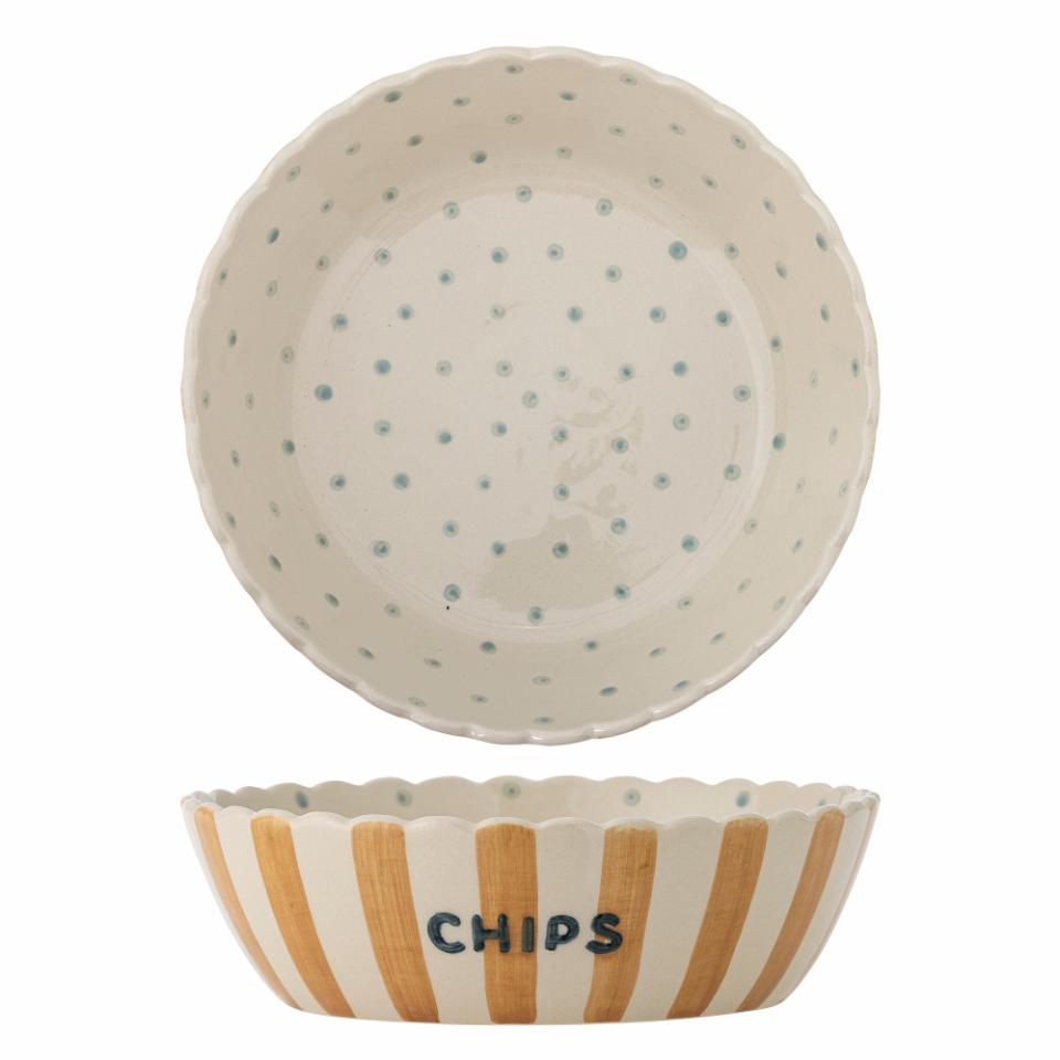 Die Chip Schale von Bloomingville ist eine Servierschale aus Steingut mit handgemalten vertikalen Streifen außen und blauen Punkten innen. Die Schale hat einen gewellten Rand und den Schriftzug „CHIPS“ in Dunkelblau. Kleine Abweichungen im Muster und in der Farbintensität können auftreten, wodurch jedes Stück einzigartig ist.