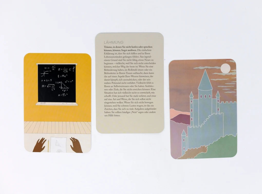 Jede Karte zeigt eine symbolische Zeichnung des archetypischen Traumes auf der einen und die Interpretation desselben auf der anderen Seite. Das Kartenset enthält zudem Anleitungen zur Verwendung der Karten und weitere optionale Spielvarianten für eine*n oder mehrere Träumer*innen. Nutzt die Macht der Träume, um euer Leben in positive Bahnen zu lenken!